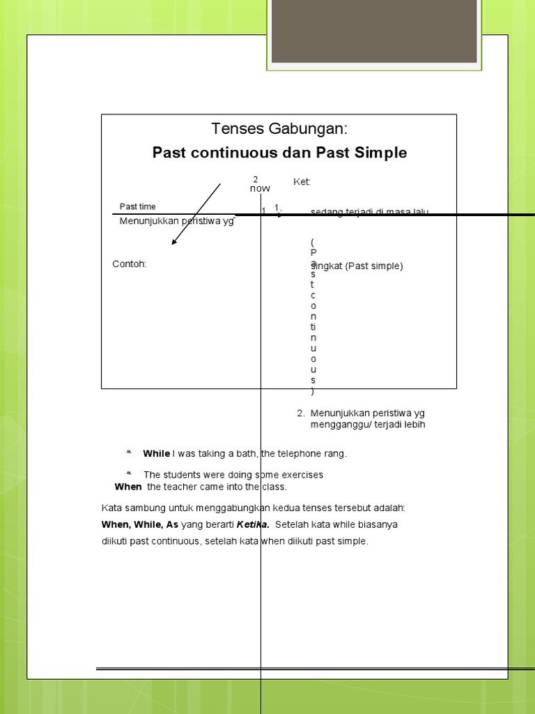 When dan while adalah dua kata sambung yang sering digunakan dalam past continuous tense. When dan while berada di dalam suatu time clause yang merupakan salah satu macam adverbial clause. During dan while sama sama dapat digunakan untuk menyatakan waktu.