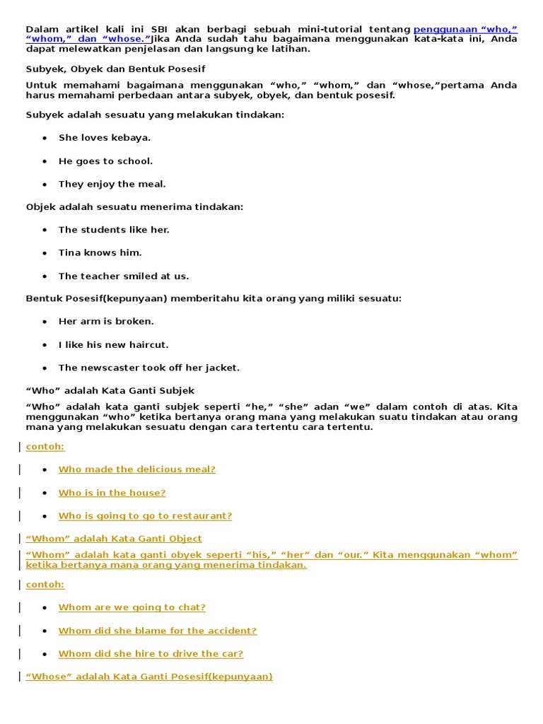 Perbedaan dan contoh dalam kalimat bahasa inggris. Perhatikan jawaban dari ketiga pertanyaan di atas berikut ini. Secara grammatical who digunakan sebagai subjek kalimat sedangkan whom sebagai object of verb atau object of preposition pada suatu relative clause.
