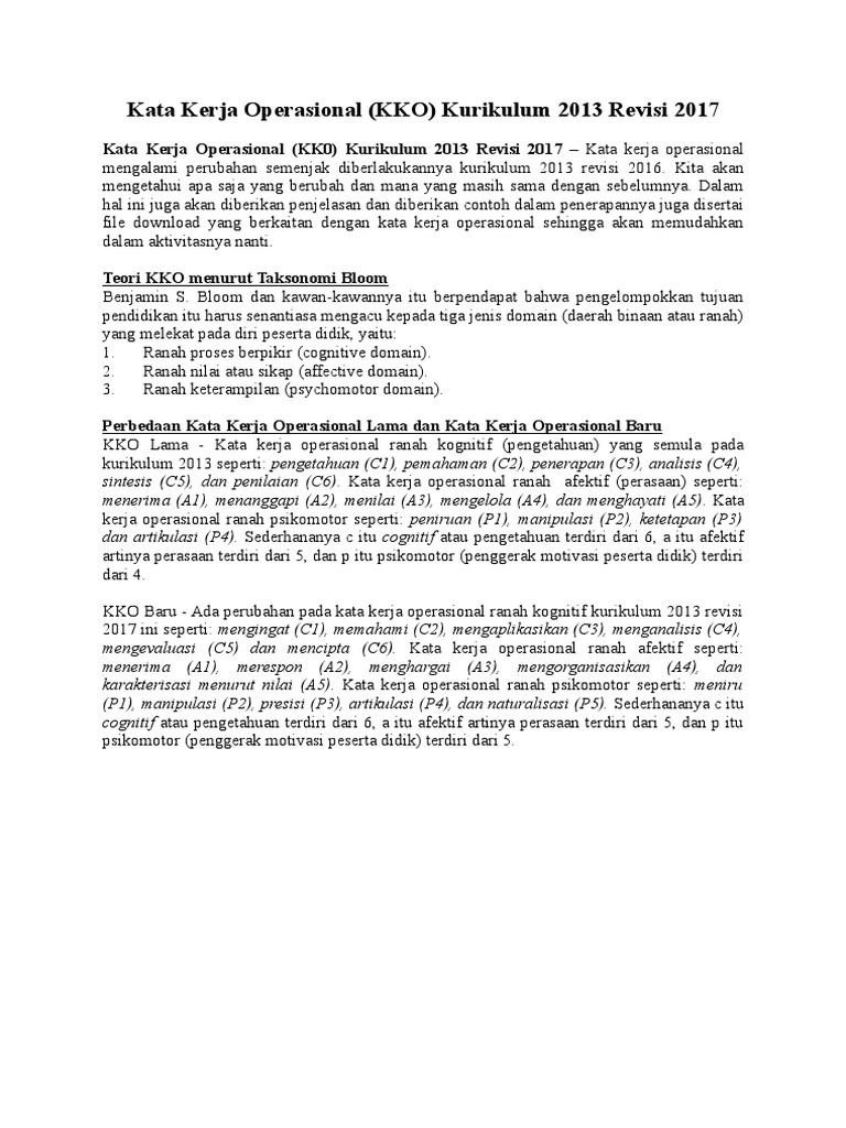 Kata kerja operasional kk0 kurikulum 2013 revisi 2016 kata kerja operasional mengalami perubahan semenjak diberlakukannya kurikulum 2013 revisi 2016. Kata kerja operasional indikator c1 c6 kata kerja operasional indikator c1 c6 digunakan untuk membuat rpp terutama pada bagian indikator. Kata kerja operasional diperlukan oleh guru saat menyusun silabus dan rpp.