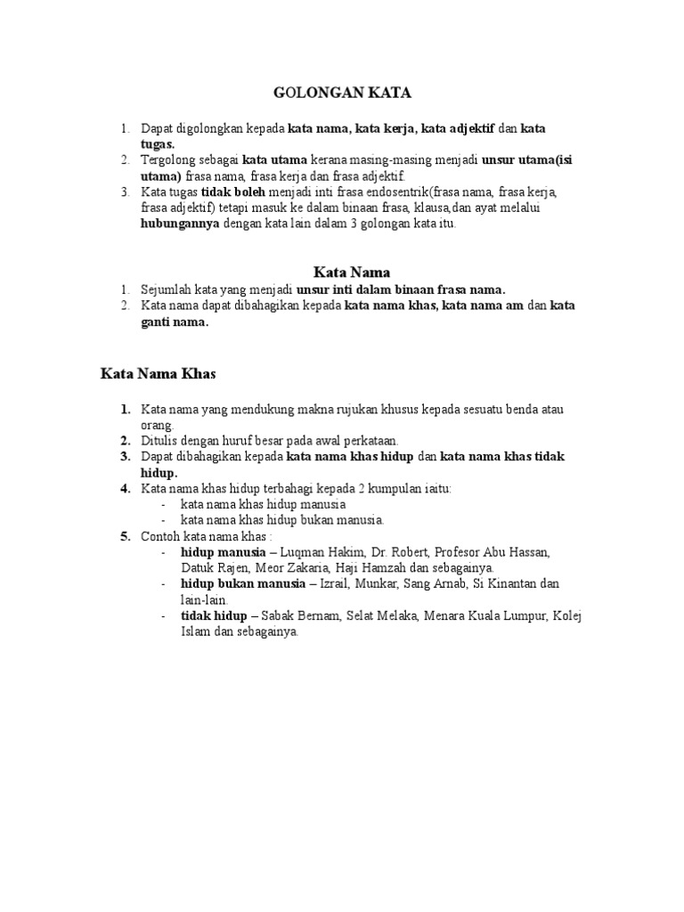 Kata nama khas digunakan untuk menyebut sesuatu seperti manusia haiwan benda tumbuh tumbuhan dan tempat secara khusus. Kata sendi digunakan sebagai kata depan kepada kata nama.